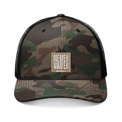 Never Waver Camo Trucker Hat — Embroidered Rustic Patch Cap